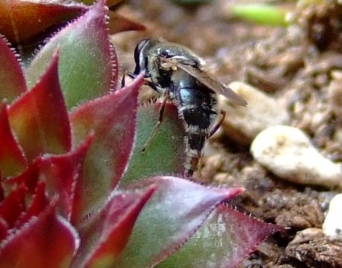 Arbeitest Du auch beruflich mit Stechinsekten, Karin? Mich besuchte heute auf der Terasse diese (ich vermute Fliege). Es hatte den Anschein, als würde Sie Eier unterhalb der Sempervivenblätter ablegen.