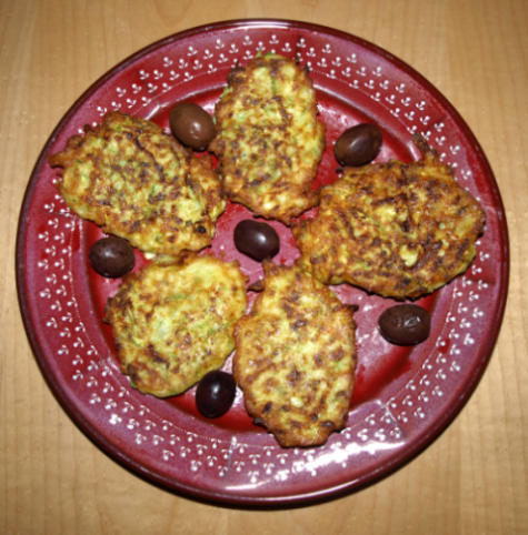 küchle ist schwäbisch, puffer wäre deutsch. aber küchle ist viel schönerIch habe mich jetzt hier ein bisschen schlau gelesen und herausgefunden, scheinbar heisst die richtige deutsche Bezeichnung für meine Zubereitungsart Küchle.Dann gabs heute Abend Zucchiniküchle griechische Art mit Feta und Minze innen drin und Oliven aussen herum.Als Vorspeise den bereits früher vorgestellten Teufelsohrensalat.kali nichta - gute nacht