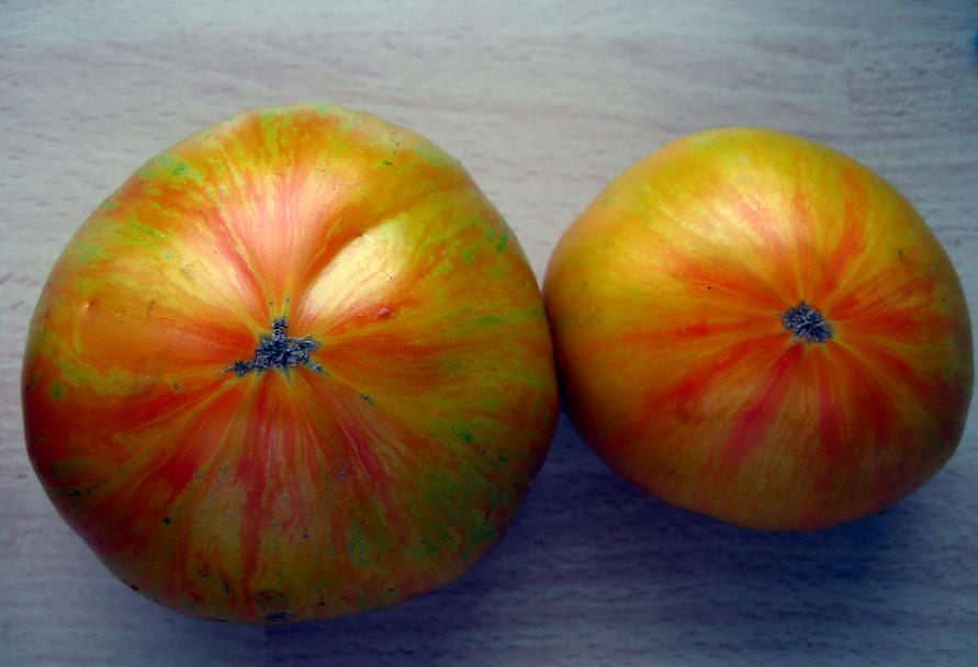 Hallo Leni,hab mich auch schon gewundert, daß sie die orangenen Stellen hat, fand aber auch einige Bilder im Internet wo das auch so dargestellt war. Ich habe sie immer gut ausreifen lassen und die Saat ist aus dem Samenarchiv von Herrn Bohl. Vielleicht liegt es auch an der vielen Hitze, die wir dieses Jahr hatten, es war oft fast 40 Grad im Gewächshaus ?? Der Geschmack ist einfach super lecker, die Ernte mehr als reichlich (mehrtriebig gezogen !) !!hallo fairy, dein erntebild sieht super aus und ich finde es toll, dass du gleich die namen dazugeschrieben hast!ich wundere mich nur über deine evergreens, auch schon auf deinen früheren bildern sahen sie -zwar wunderschön- aber für mich doch ungewöhnlich rot/grün-gefärbt aus. kann es sein, dass sich da was eingekreuzt hat? bisher kannte ich sie nur grün/gelb/ocker-farben.guck mal hier im tomatenatlasdie evergreen schmeckt uns übrigens ausserordentlich gut.liebe grüsse von leni wHallo,ich habe gestern mal mit ernten der Tomaten ausgesetzt, heute hat es sich dafür wieder gelohnt:http://www.pic-upload.de/06.08.08/j483ms.jpg