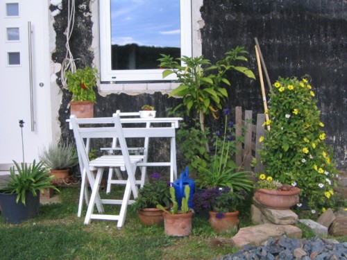 .Dann werde ich mal meinen Sitzplatz für dieses Jahr auch hier reinstellen.Ist zwar mitten in einer Baustelle, aber ich fühle mich dort abends mit einem Glas Wein, wenn ich auf das Dorf und den gegenüberliegenden Hang schauen kann pudelwohl.