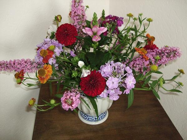 mein strauß schon vor tagen - mal was ganz ordinäres: goldrute mit lila monarden und rudbeckien und miscanthus in der bodenvase - die halten sich echt klasse!und auf dem gartentisch steht eine vase mit weißem phlox und rotem sonnenhut mit wasserdost - dort halten die sich besser als drinnen!