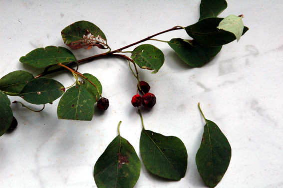 Die Felsenbirnen sind schon lange abgeerntet. Vom Blatt würde ich auch eher auf Felsenbirne tippen, aber, wie gesagt, die Zeit stimmt nicht.