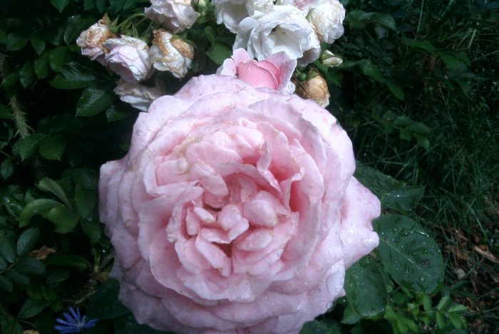 romantische Blüten, üppiger Wuchs und intensiver Duft: Frederic Mistral, eine Teehybride von Meilland (nach dem Regen fotografiert, im Hintergrund Ritausma)