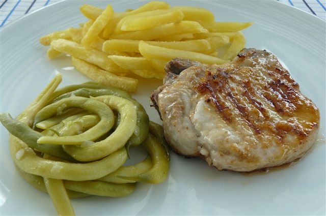 es gab:TomatensalatKotelette, Pommes frites, Bohnen (grünes und gelbes Posthörnchen)Rotweinzwetschgen mit Zimteis