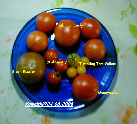 Zum ersten Mal war die Untertasse zu klein, nur ein Dessertteller konnte es fassen... Soviel auf einmal hatte ich noch nie...Gleich einige meiner Sibirians waren soweit, dann noch die Größte der noch hängenden Black Russians (Pflanze geköpft), eine erste aus den satt und gesund dahängenden Rispen am Moneymaker, drei der roten Fehlsaat (keine Ahnung was es für eine Sorte ist, aber gesunde Pflanze, leckere Früchtchen), vier der beiden Tumbling Tom Yellows....Ein paar Sonnenstunden nur und grün wird zu rot, - Freude
