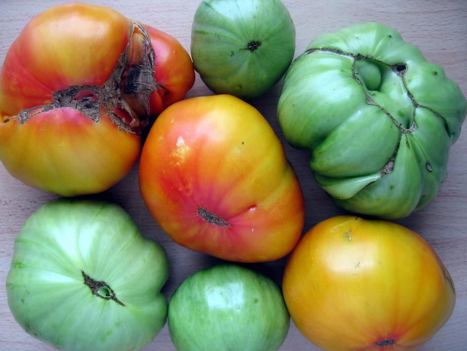 Das ist der Rest, den ich von meiner verkreuzten Big White Pink Stripes geerntet habe. Das verknorzelte Teil rechts oben war mein Hoffnungsträger für die dickste Tomate diesen Jahres, ist auch im grünen Zustand mit ca. 650 Gramm die Nummer eins geworden. In Summe waren das 2 KG