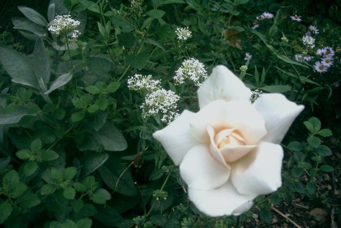 Michele mit ihrem Hofstaat: weiße Spornblumen, Zitronenmelisse, Salbei und Schönastern (Kalimeris)