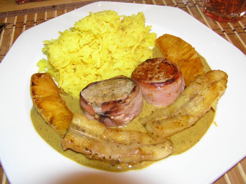 wir hatten schweinefilet mit currysoße, kurkumareis und gebratene früchte