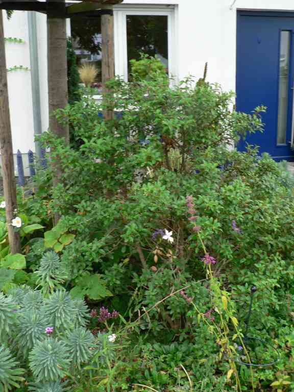 Mein Osmanthus steht auf der Südseite des Garten, bekommt also volle Sonne (was ihm eigentlich nicht gefallen sollte). Der Standort hat gute Drainage, der Boden ist sandig-humos, und ringsherum gibt es einiges an Konkurrenz. Trotzdem ist die Pflanze ziemlich wüchsig und sehr dicht. Ich bin mir allerdings jetzt nicht sicher, ob ich burkwoodii oder delavayi habe. Nach den Fotos bei Esveld würde ich den Strauch aber burkwoodii zuordnen.