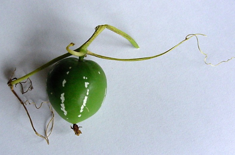 und hier nochmal von unten.Wenn ich das von der zu identifizierenden Frucht gemachte Foto ansehe, dann sehe ich zudem eine "Teilung" der Ranke. Das ist fuer Passiflora aeh... mindestens ungewoehnlich, wenn nicht gar unmoeglich. Also saemtliche Passis der unterschiedlichen Arten, die ihr Dasein bei mir fristen, haengen sich mit einem einzelnen Korkenzieher wo fest. Waehrend eben Kuerbisgewaechse so so typisch geteilte Ranken haben?!