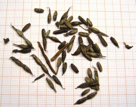 Gehölz 2:Hier habe ich leider nur die Samen fotografiert, der Rest stammt aus meiner Erinnerung:Strauch, etwa 1m hoch in der Küsten-Garigue, höchstwahrscheinlich Vertreter der Fabaceae.Die Fruchtstände sind gliederartig und zerfallen in die einzelnen Samen, von denen der letzte durch die Hülle spitz verlängert wird. - leider sind fast alle beim Sammeln zerfallen.Könnte es Coronilla juncea sein?