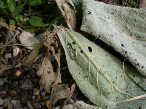 Normalerweise frißt an Königskerzen der Wollkrautmönch, aber der ist es mit Sicherheit nicht. Das sieht mir nach einer kleineren Larve aus, kein Schmetterling, eher etwas in Richtung Fliege...Auf deinen Fotos scheint es, als fräßen die Viecher nur am welken Laub - bist du sicher, daß sie auch an frischen, gesunden Blättern nagen? Möglicherweise hat der Schaden an deinen Königskerzen andere Ursachen, wie du schon sagst, zuviel Feuchtigkeit, und die Larven entsorgen lediglich die Reste. Auch in den Knospe kann Fäulnis oder Welke entstanden sein.