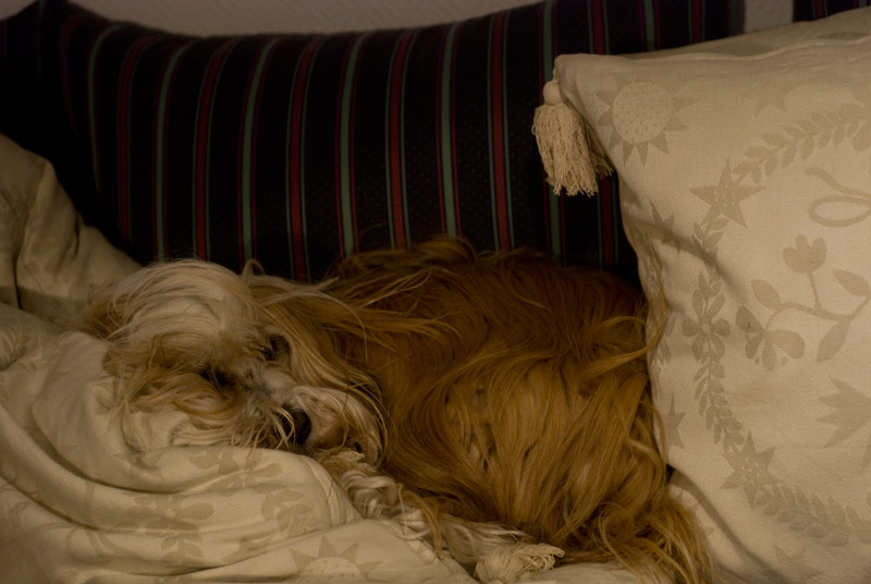 der Hund fand, dass ihm ein Platz zwischen den auf einer Liege im Arbeitszimmer deponierten Gartenmöbelkissen zusteht