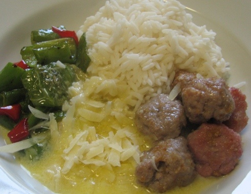 heute gab es in olivenoel geroesteten paprika, hack- und mett-baellchen. dazu eine knoblauch-kaesse-sosse. als beilage reis.