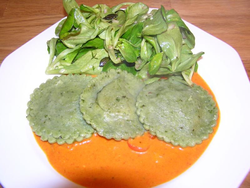 brennesselravioli mit tomaten-ricotta füllung. dazu paprika-parmesanrahm und feldsalat mit kürbiskernen