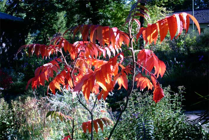 Und der geliebt/gehasste Essigbaum. Für ihn gilt das Gleiche wie oben gesagt.Das Exemplar steht in sehr schlechter Erde und hat daher nur wenig Zuwachs; in zehn Jahren hat er nur einen (!) Ausläufer produziert. Dafür ist die Herbstfärbung recht zuverlässig.