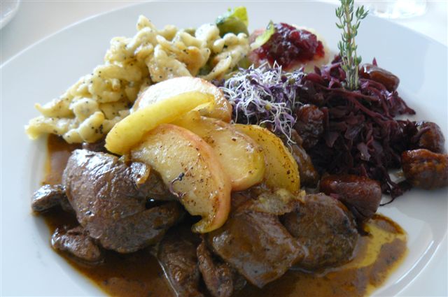 Das sieht natürlich auch ganz toll aus, und wäre etwas für meinen Gaumen.Vor allem: Gesünder als Schweinshaxe!danach:geschnetzeltes Rehfleisch mit Pfifferlingen, dazu Mohnspäzli, Rotkraut, Rosenkohl, caramelisierte Apfelschnitze und Kastanien