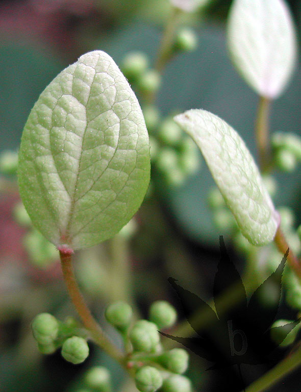 Ich habe bei meiner letztes Jahr gepflanzten Schizophragma 'Moonlight' letztens festgestellt, dass die neuen Blätter erstmal reingrün sind und erst nach und nach den Grau-Schleier anlegen