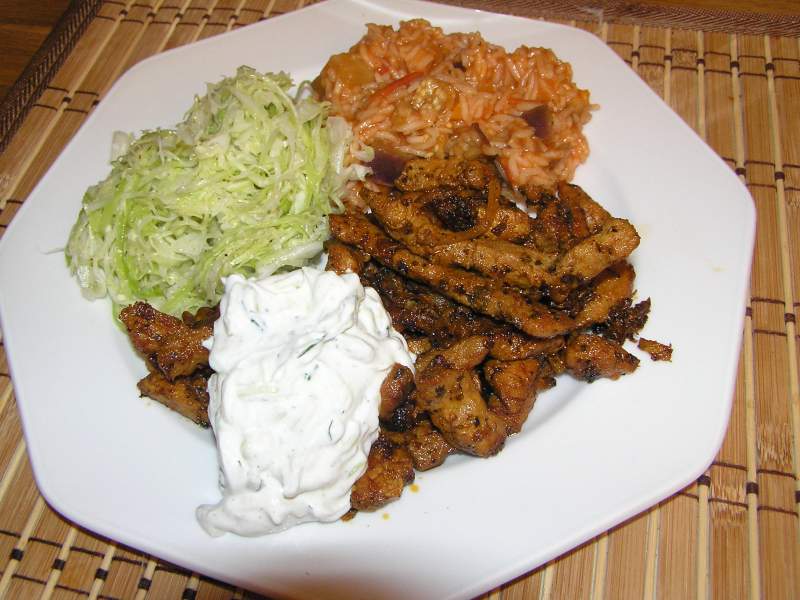dazu diesmal gemüsereis (paprika, tomate, aubergine..alles gartenernte), tzatziki und spitzkrautsalat