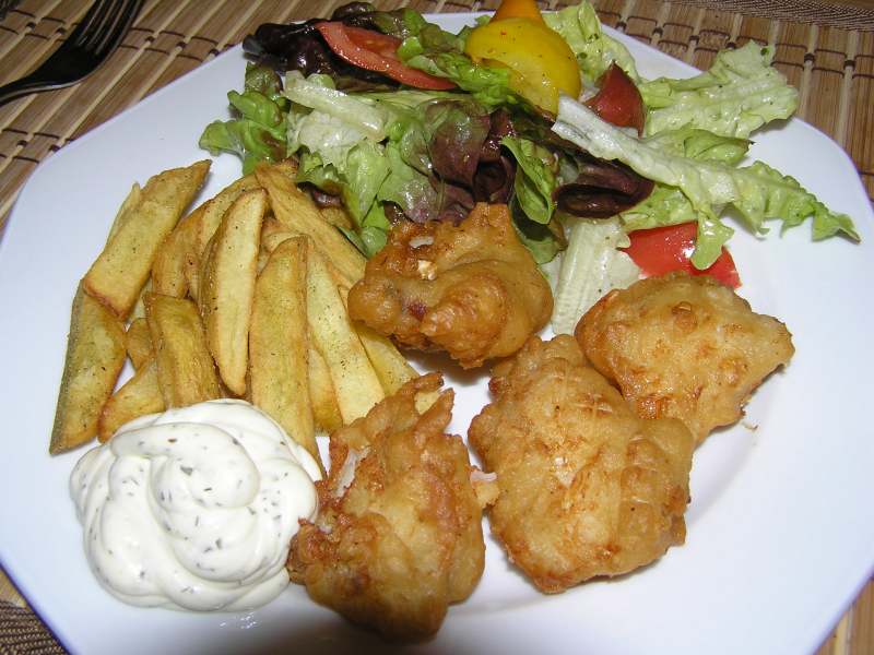 also musste schnell umdisponiert werden und es gab einfach fish & chips - selbst gemacht. ging flott, hat lecker geschmeckt. dazu natürlich remoulade und salat mit tomatenspalten.