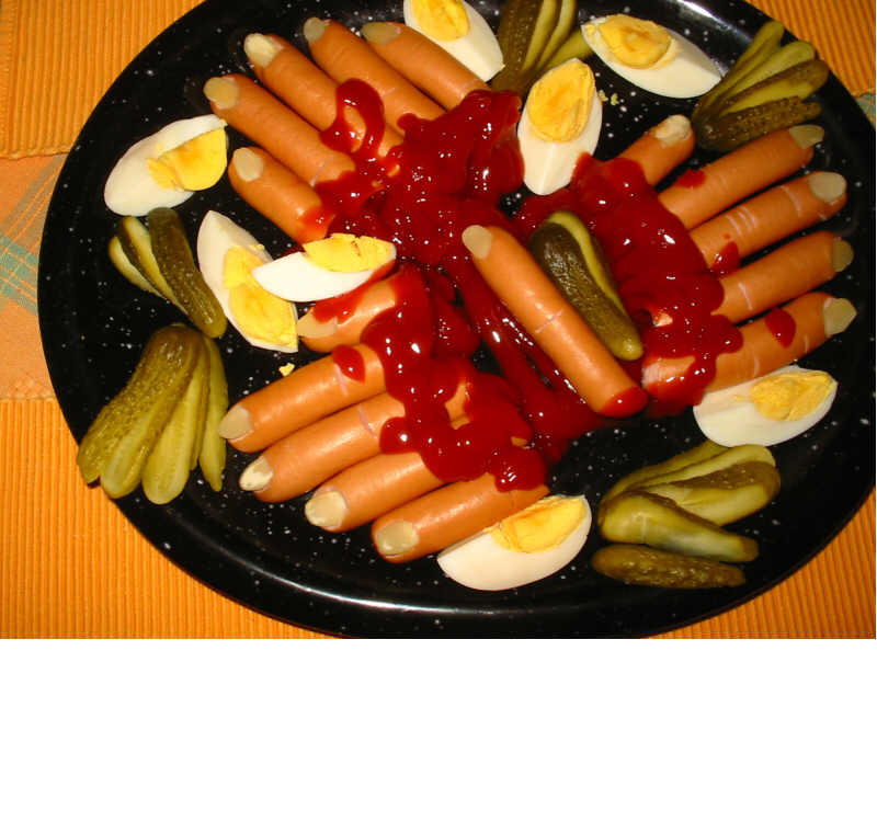 !Also gab es hier heute zunächst Gulaschsuppe ohne Spinnen, dann Nudelsalat mit Hörnchennudeln a la Hirn, dazu noch abgehackte Finger mit Blut (erst dachte ich, GG findet es irgendwie nicht ganz so witzig, er hat aber die Fingerchen abgeschleckt, genau, wie die Hex im Knusperhaus