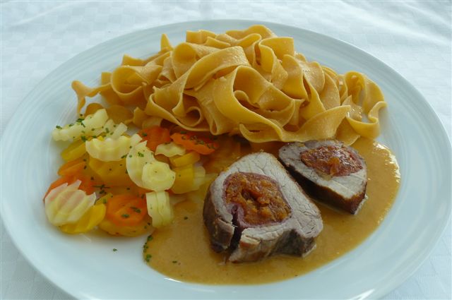 es gab:Blattsalat mit grünen, unreifen Tomaten im AusbackteigBraten gefüllt mit getrockneten Aprikosen und Ingwer auf Aprikosensauce, bunten Karotten und Kürbisnudeln