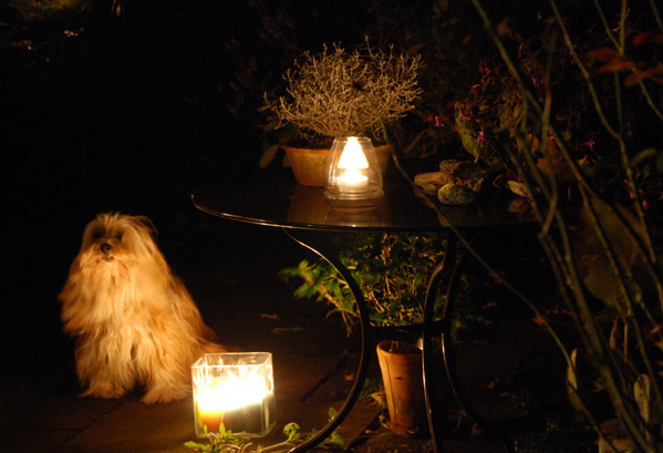 Gartenlady, auf was hast Du scharfgestellt? Hundegesicht? tischkante? steine rechts? nicht auf die kerzen scheinen mir zu hell für mittenbetont belichtet.was hältst Du von der beschnittenen version, ohne den hellen fleck rechts im bild?lg, brigitte