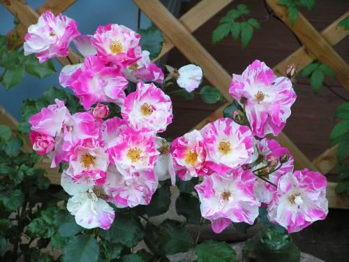 Die zweite gestreifte ist eine Kletterrose. Leider weiß ich den Namen nicht, ich hab sie letztes Jahr geschenkt bekommen. Auch sie blüht unermüdlich und duftet zart.Vielleicht weiß jemand den Namen der Schönen?Letztes Jahr hab ich im Rosengarten Forst so eine ähnliche gesehen, die hieß Papageno, allerdings als Hochstämmchen. Seitdem nenn ich sie einfach so, der Name passt zu ihr und vielleciht ist es ja gar nicht so falsch?