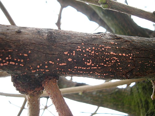 Google mal nach "Rotpustelkrankheit" oder nach "Nectria".Der Pilz ist ein Schwächeparasit: Er befällt frisch abgestorbenes oder absterbendes Holz, geht aber nicht in gesunde, vitale Triebe. Der befallene Trieb wird nicht zu retten sein. Am besten den Trieb unterhalb der Befallstelle - mit Sicherheitsabstand - abschneiden.