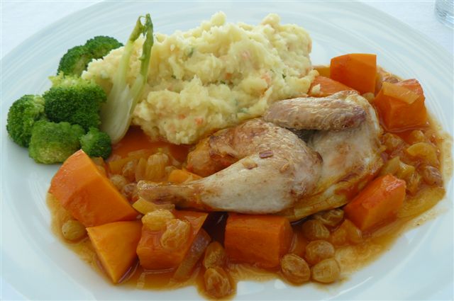 ... heute gab es:einen Karottensalat mit Rosinen an einer Salatsauce mit Honig und Zimtdanach ein Poulet-Tajine mit einem Kartoffelgemüse-Püree und Broccolidie Süsskartoffeln habe ich durch Kürbis ersetzt