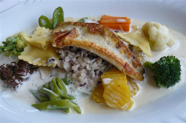 hier sind die Spinat-Bällchen von freitagsfishich war schon wieder auswärts, es gab:FenchelcremesuppeZander gebraten auf Reis mit Gemüse an einer Noilly Prat-SauceSchokoladen-Mousse mit frischen Früchten garniert