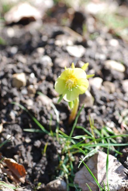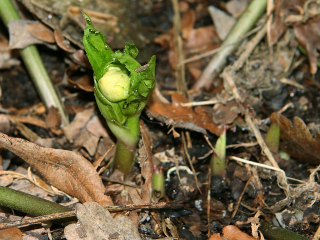 Die Kreuzungen von H. orientalis mit Wildarten finde ich auch besonders spannend. Die daraus entstehenden Pflanzen passen gut in einen naturnahen Garten und stehlen den anderen, zarten Frühlingsblühern nicht die Show, sondern harmonieren mit ihnen. Sie haben oft interessanteres Blattwerk. Meine Kreuzungen mit H. purpurascens haben runde Blütenblätter in milchigen, opaken Farben und sind im Austrieb schon ziemlich hübsch, weil die Blätter die Knospen wie Finger umschlingen. Später entfalten sie sich, als würden sie die Blüten auf Händen tragen.Zu den "Wilden Gelben": Diese Pflanze sah ich in Slowenien. Bild ist schlecht, ich stand knöcheltief im Matsch. Ich habe mich gefragt, ob die so gelb ist, weil sie sich erst durch einen Maulwurfshügel hatte arbeiten müssen, oder ob sie so bleibt.Außerdem gibt es ja noch was anderes als nur Helleborus.![]()