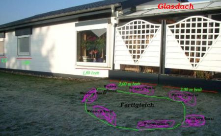 mmmmhhh, die Bilder sinad aber wirklich sehr klein, hoffentlich kann das überhaupt noch jemand entzifern, was ich da an Angaben reingenschrieben habe...Von der Hecke links aus geschaut in Richtung anzulegender Fertigteich vor den beiden Holzkästen, in denen wir blauen und gelben Wein gesetzt haben...