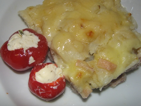 heute gabs auflauf. und da man es auf dem foto nicht wirklich sehen kann:1 schicht vorgekochte kartoffeln, eine schicht hackfleisch, ein dicke schicht vorgekochten blumenkohl und als abschluss eine schicht sbrinz.dazu mit frischkaese gefuellte leicht scharfe chilis.