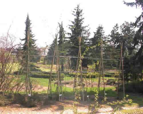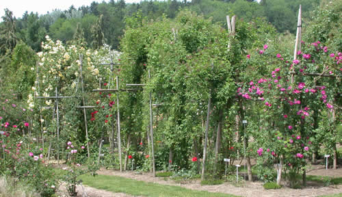 Hier habe ich 2007 eine Fünfergruppe Kletterer in einem Schaugarten, aufgenommen im Februar, damit man gut sieht wie sie wachsen, oder gehalten werden. Die Rosen werden so 5 Jahre alt sein. Sie sind etwa 80 cm bis 100 auseinandergepflanzt. Jede beansprucht ungefähr 25 cm rund um sich herum mit den Austrieben.Die Rosen sind: Zephirin Drouhin, eine Wichurana ohne Namen, Wedding Day, Veilchenblau und Tausendschön.Bis jetzt habe ich ähnlich gepflanzt, auch mit einem Meter Abstand zwischen den Klettereren. Es ist eng und braucht, wie schon gesagt wurde, viel Arbeitseinsatz. Je mehr Stacheln, desto ärger ist der Einsatz.