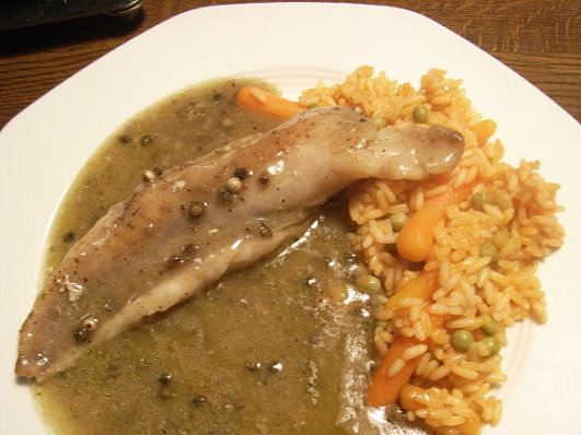es gab-seeteufel an weiss- grüner pfeffersosse- mit -risi- bisi -