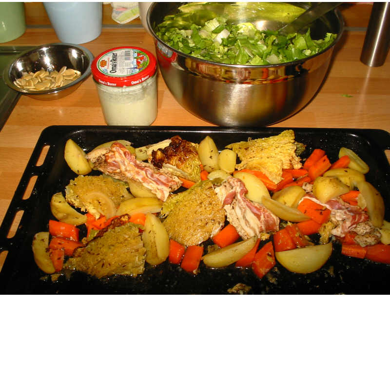 Meinst du mich, tomatengarten?Mit all den Hochglanz-Essensfotos, die hier mittlerweile kursieren, kann ich nicht mehr mithalten, hier nur das Blech, vorm Aufwärmen heute, dazu gibts Endiviensalat, in dem Sülzenglas ist das Sahnedressing. Die Kürbiskerne haben sich aufs Foto verirrt.