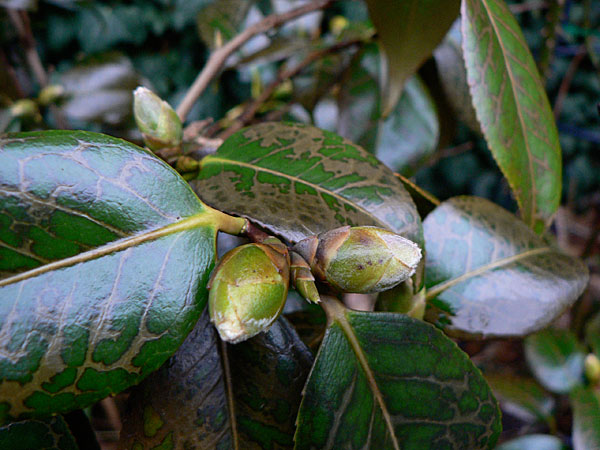Die Kamelie sieht schlimm aus... aber der vollsonnige Stand in Lehmboden ist mehr als suboptimal.