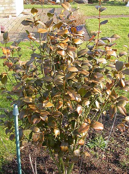 Der Kirschlorbeer und auch die Photinia auf dem folgenden Bild werden wohl ihr Laub verlieren. Die Rinden sehen noch okay aus.