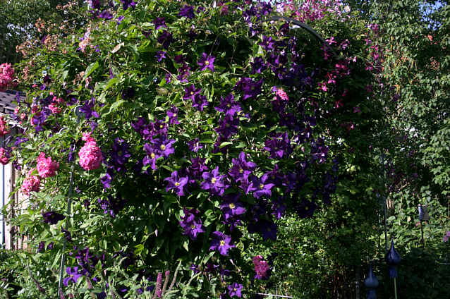 Hallo Uliginosa,"HS" bedeutet "Halbschatten". Wenn Du eine weiße Viticella hast, handelt es sich möglicherweise um "Hagelby White". Die botanische Art ist blauviolett. Der Farbton schwankt, je nach Herkunft. Ich stelle Dir mal ein Foto von der "Alba Luxurians" ein.Ich glaube, es wäre eine gute Idee mal einen Thread zu eröffnen "Lieblingsclematis" mit Fotos und Begründung, also Aussagen zum Thema Höhe, Breite, Blühfreudigkeit, Gesundheit, etc. Du hast natürlich Recht, dass viele Faktoren vom Standort abhängig sein können, aber einige Sorten machen fast überall eine gute Figur. Außerdem ist unser Garten ein Härtetest für die Pilzanfälligkeit von Pflanzen, obwohl das schon besser geworden ist. Unser Baugebiet wurde vorher landwirtschaftlich genutzt und das ist wohl leider eine Folgeerscheinung davon.Es ist nicht nötig, dass Du die Clematis 1 bis 1,5 m von der Rose entfernt pflanzt, sondern nur so, dass sich die Wurzelbereiche nicht stören. Bei uns stehen einige Clematis am Ziergitter in so einer großen Entfernung zu den Kletterrosen, an einer Stelle steht die Rose vor dem Pergolapfosten und die beiden Clematis seitwärts. Wichtig ist, auf die Schnittgruppe 3 bei den Kletterclematis zu achten oder eine Staudenclematis zu pflanzen. Außerdem solltest Du nicht eine Monsterclematis wie z.B. Cl. flammula "Rubromarginata" zu einem eher zarten Röschen pflanzen. Das ist alles. (Abgesehen von der Wahl der passenden Farbe