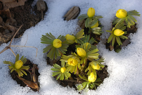 Auch hier kommt und geht die Kälte, kommt der Schnee und schmilzt wieder. Schon die letzte Wochen haben sich die Winterlinge etwas hervorgewagt, jetzt halt wieder durch den Schnee: