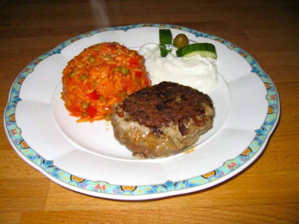 Es gab mit Feta gefüllte Hackfleischküchle mit Gemüsereis und Tzatziki