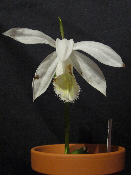 Wenn die Mäuse in so kurzer Zeit die mühsam zusammen getragene Sammlung vernichten, ist das wirklich mies... >:(Meine Pleione ruhen (ruhten) im Kühlschrank. Da sind Mäuse eher kein Thema. Die erste für dieses Jahr - Pln. formosana alba. Okay, die zählt nicht wirklich, weil ich sie bereits blühend gekauft habe. Die leichten Schäden stammen vom Transport (ich hatte nicht angenommen, dass bei Bestellung im Februar blühende Pflanzen eingepackt werden).Viele GrüßeZwiebeltom