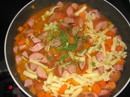 ).deshalb zuerst das foto von der halbfertigen (selbst-getrocknete petersilie liegt schon obenauf: das saemig-machen ist in procedre)wurst-pfanne am samstag: