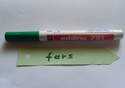 Der 30 Opak von Meyer (ist aber von Edding und hat irgendeine Nummer) hält ewig. Fast. Er schreibt auf Lackbasis und trocknet sehr schnell ein, weshalb wir immer ein Gläschen Verdünnung in Reichweite haben. Da wird die Spitze kurz eingetunkt und dann geht es wieder.