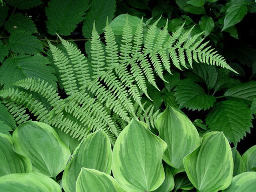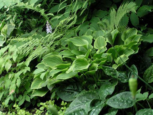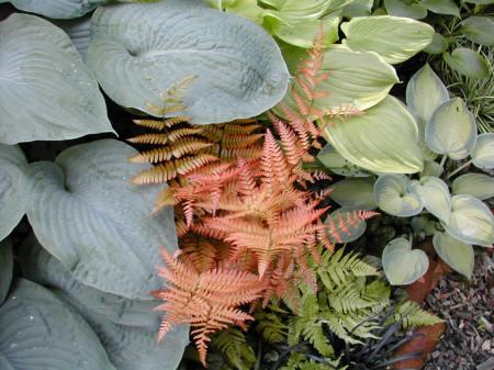 Ja, die Blattstrukturen haben es mit angetan.Auch in Blütenstaudenbeeten versuche ich immer auch die Blattstruktur zu berücksichtigen, damit es immer gut aussieht und nicht nur während der blüte.PS: Dieses Bild gibts glaub ich schon mal wo....Auf nina's ansuchen die namen: Blaue große Hosta = Hosta 'Elegans', roter Farn = Dryopteris erythrosora, kleine bunte Hosta = June, weißgerandete Hosta = Fragrant Bouquet