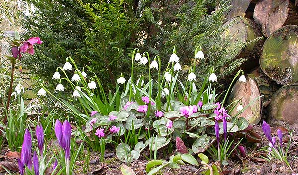 Hier stehen die Märzenbecher auch in totaler Trockenheit.Ihr glaubt nicht, welche Verrenkungen ich unternehmen musste beim Versuch diese Frühlingsszene einzufangen (ich hätte natürlich ein anderes Objektiv als das 105mm Makro holen können, aber dann hätte ich ja ins Haus gemusst)Diese rosa Heli ist ein Sämling, hat sich selber an diese Stelle gesät, sie ist nichts besonderes, aber die Kombination violett, rosa, weiß finde ich besonders im Frühling immer wieder schön.