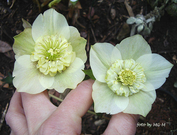 Diese Helleborus habe ich vor 2 Wochen gekauft. Da war nur eine Blüte göffnet (links auf dem Foto). Sah natürlich nicht so toll aus. Aber ich war optimistisch, daß die nächsten Blüten besser werden. Zu dem Zeitpunkt war es immer sehr kalt gewesen und alle bisherigen Blüten zeigten Probleme. Und ich finde, ich habe Recht gehabt. Die Blüte rechts im Bild sieht schon viel besser aus