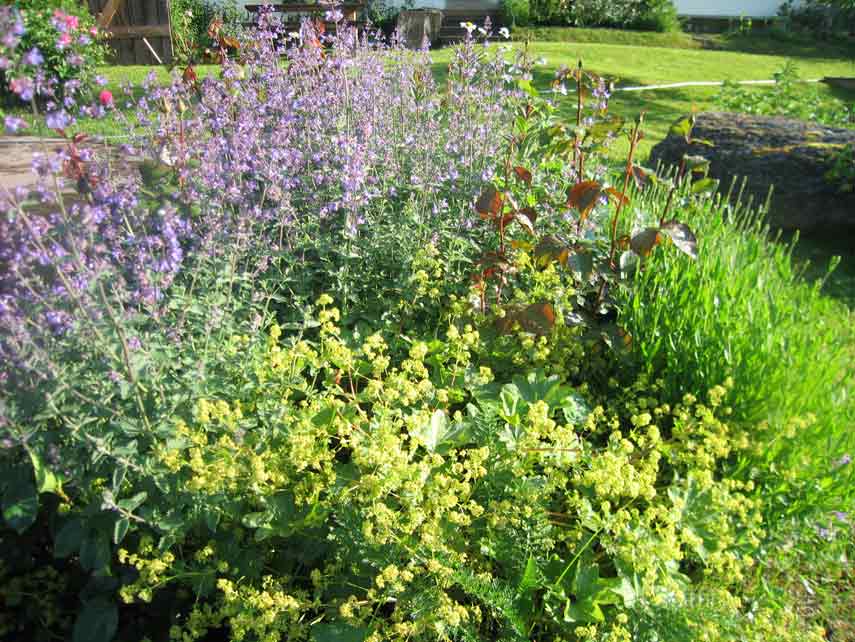 Wie es bei mir aussieht, werde ich frühestens in zwei Monaten wissen, vorläufig denke ich lieber nicht daran. Im Frühjahr 2008 mußte ich meine Ths wirklich bodeneben zurückschneiden, ich hatte hier schon einen Thread gestartet, weil ich mich um Ersatz umschaute. Der Winter war wesentlich milder gewesen als die vorangegangenen, ich hatte die Fichtenzweige zu früh entfernt, dann kamen, diesmal extrem spät, die Spätfröste. Aber siehe da, im Sommer waren sie alle wieder da, wenn auch etwas später als sonst.Auf dem schlechten Foto sieht man hauptsächlich die Unterpflanzung, die ich absichtlich hatte wuchern lassen, solange sie noch klein waren. Es ist vom 22 Juni