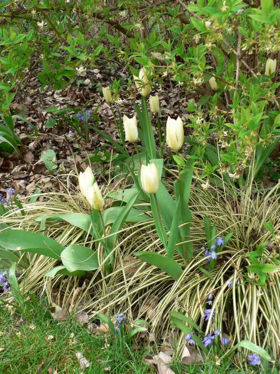 2.Kombination (gegenüber): unter Lonicera x purpusii, kombiniert mit Carex Evergold und wieder Tulpe Purissima und auch wieder "verfolgt" von Kaukasusvergißmeinnicht. Leider bilden Zillas auch nach 4 Jahren immer noch nicht die blauen Teppiche, die ich mir wünsche. Ich hab hier auch keine Fernwirkung, nur "Nah"...